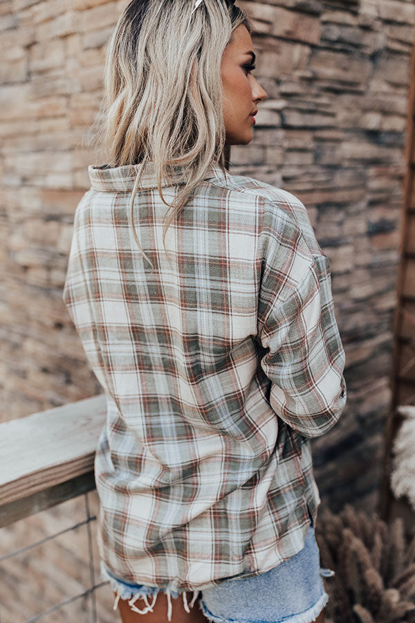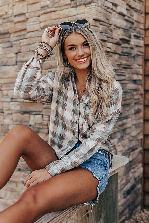 You will be destined for fashion greatness when you complete your look with this cute top featuring lightweight material patterned with a natural and light blue/green hued plaid print, a button up front with a collared neckline, long loose sleeves with button closure cuffs, a single accent chest pocket, and a relaxed silhouette that falls into a straight hemline!