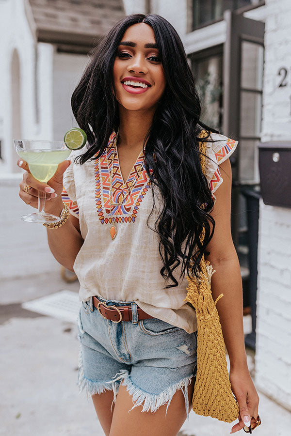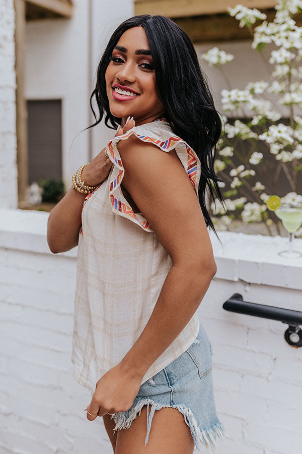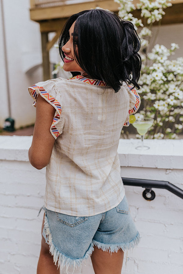 We have no doubt you will feel ethereal in this natural hued top featuring lightweight material patterned with a subtle plaid print, colorful embroidered detailing throughout, a v-cut neckline, ruffled cap sleeves, and a relaxed silhouette that falls into a straight hemline! Measurements