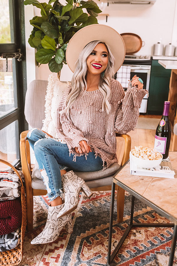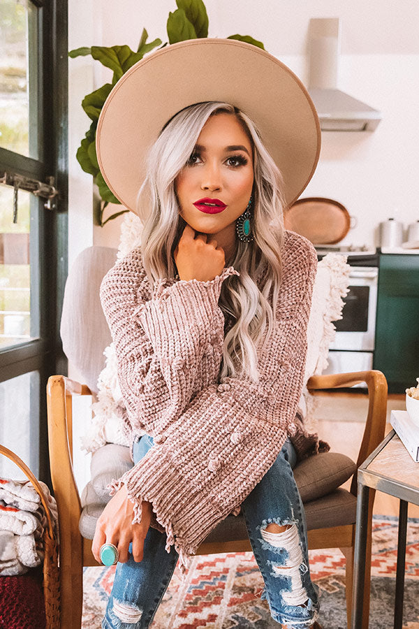 You are sure to wish that fall could last forever when you see how cute and warm this charming taupe colored sweater is featuring soft lightweight tight knit chenille material with vertical ribbed texturing, large pom pom accents, a high rounded neckline, long loose sleeves, ultra distressed trim detailing, and a relaxed silhouette that falls into an uneven hemline!