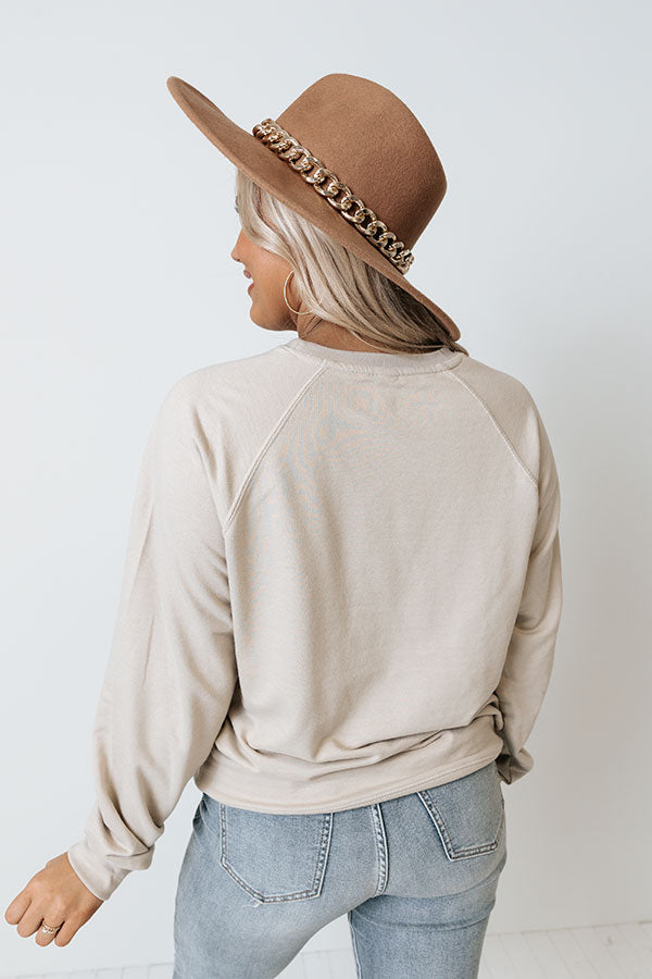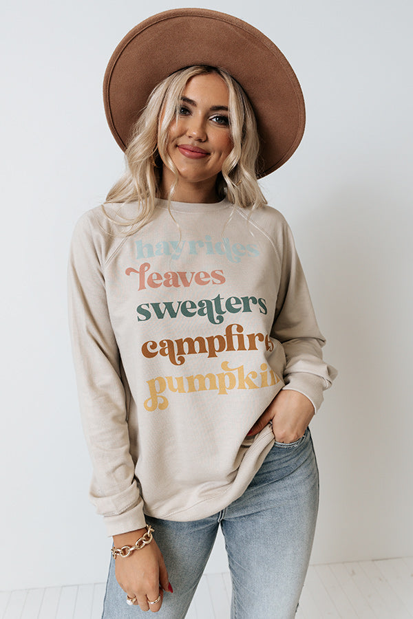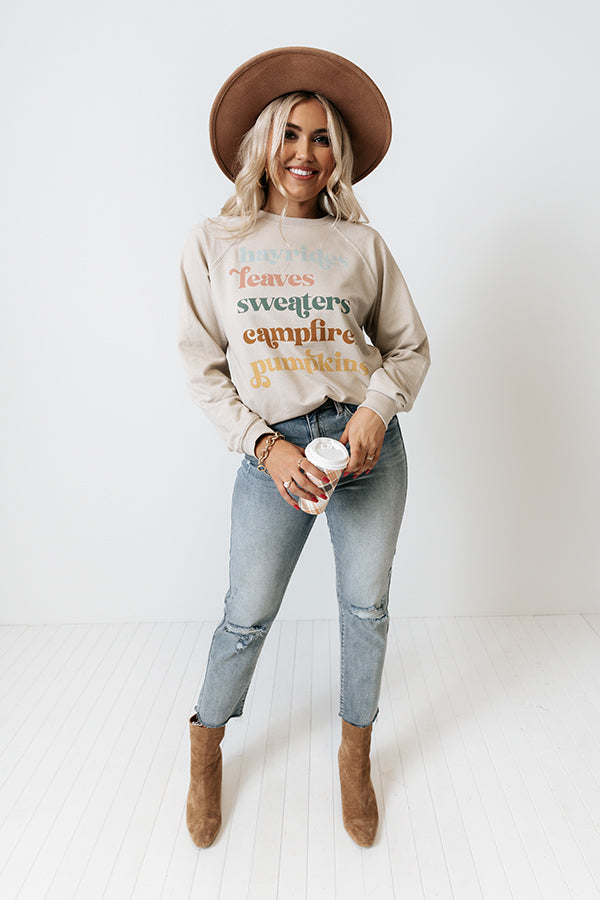 Make a statement this fall in this adorable stone hued graphic sweatshirt featuring soft and lightweight cotton blend material with cute seasonal colored lettering on the front, a rounded neckline, long loose sleeves with fitted cuffs, and a slouched silhouette that ends in a straight hemline! Measurements