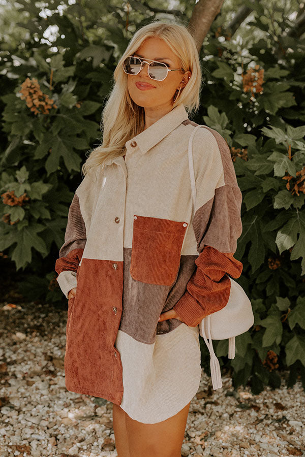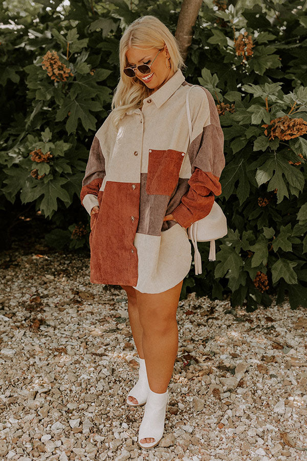 Cozy up in our adorable plus size 'Felt The Chill' top featuring trendy corduroy material with brown, rust, and beige color block panels, a button up front with a collared neckline, long loose sleeves with button closure cuffs, a single accent chest pocket, and a relaxed silhouette that falls into a rounded hemline!