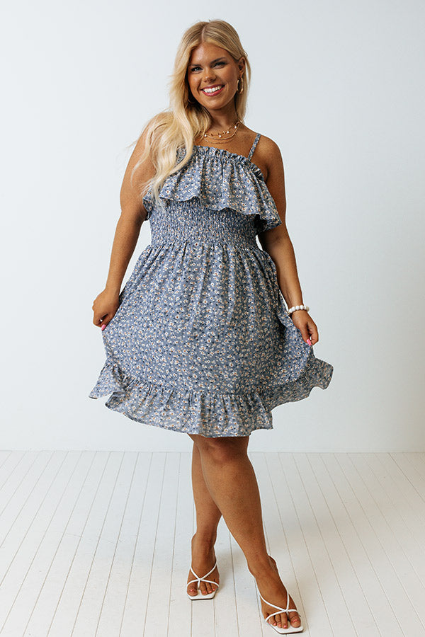 Flirt your way through summer in this darling airy blue plus size dress featuring lightweight material patterned with a small floral print, a straight elastic neckline with ruffle trim detailing, adjustable spaghetti straps, a wide smocked waistline with an overlay bodice, and a relaxed skirt silhouette that falls into a ruffled mid-thigh length hemline!