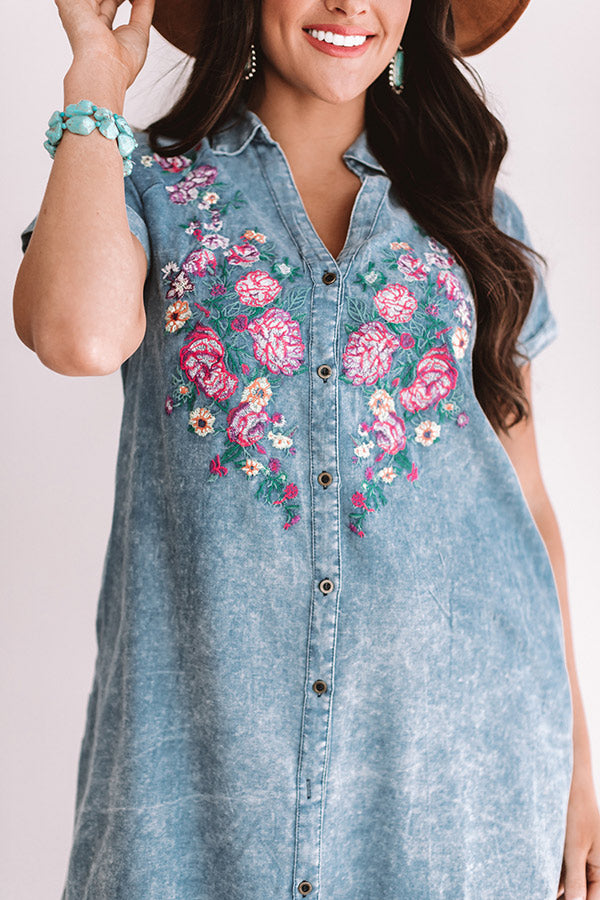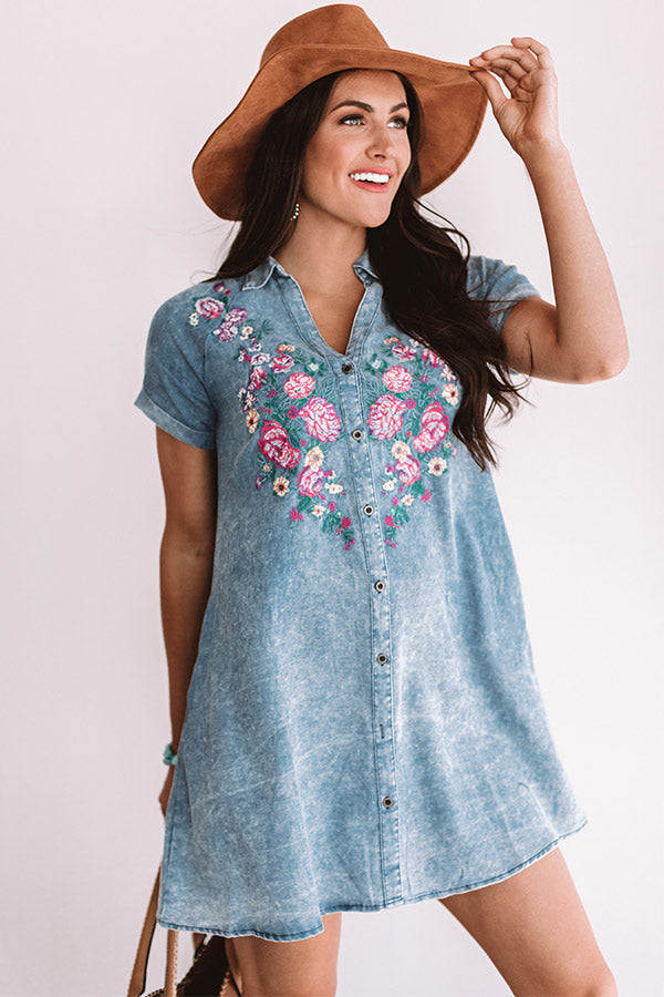 Your summer style won't need a "fresh start" when you add this chambray shift dress to your wardrobe, especially since it's adorned with delicate embroidered pink flowers around the v-neckline, a button down front, two pockets, a collar, and rolled sleeves! This adorable piece can be paired with a matching neutral cutout wedge, tote, and faux suede hat or with our "Darcy Heel in Blush" and "Parisian Travels Crossbody in White" for a wear anywhere look that you will never want to take off! Measurements