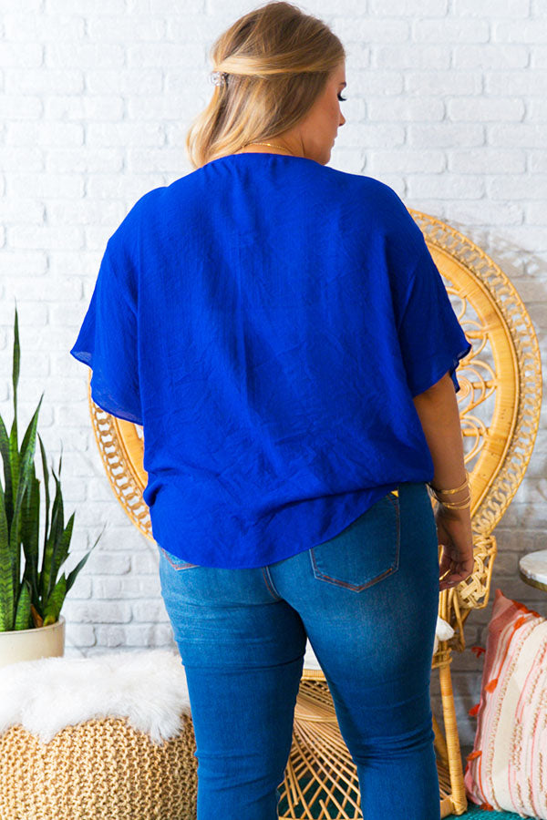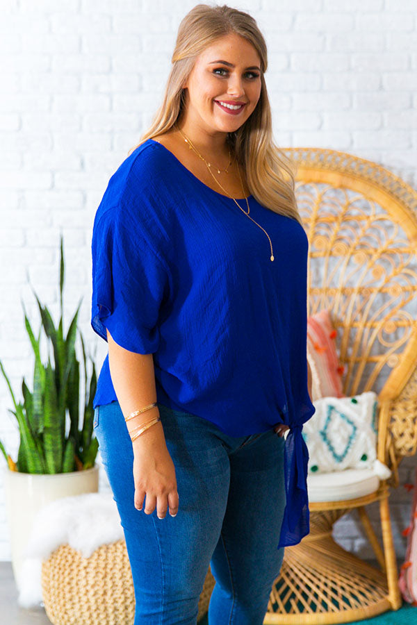 Go on... TIE it on! This stylishly simple sweetie has a round neckline, short sleeves & a relaxed poly rayon bodice with a trendy tie-sided hem. Complete your look with your favorite denim, a sassy sandal or wedge & a fun statement earring!