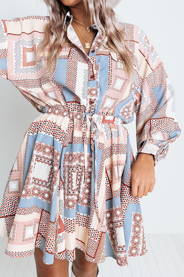 Believe us when we say this unique dress will be a 'glam slam' with its lightweight material, intricate airy blue and natural hued print, a button up front with a collared neckline, long loose sleeves with button closure cuffs, a cinched waistline with a tie closure, two faux pocket chest flaps, and a relaxed silhouette that falls into a straight mid-thigh length hemline!