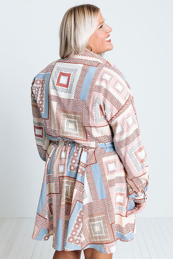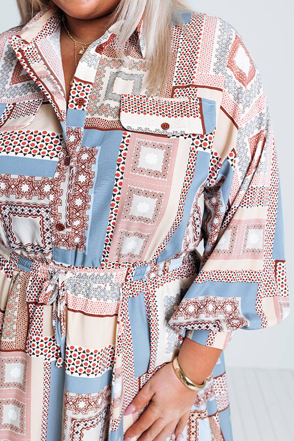 Believe us when we say this unique plus size dress will be a 'glam slam' with its lightweight material, intricate airy blue and natural hued print, a button up front with a collared neckline, long loose sleeves with button closure cuffs, a cinched waistline with a tie closure, two faux pocket chest flaps, and a relaxed silhouette that falls into a straight mid-thigh length hemline!