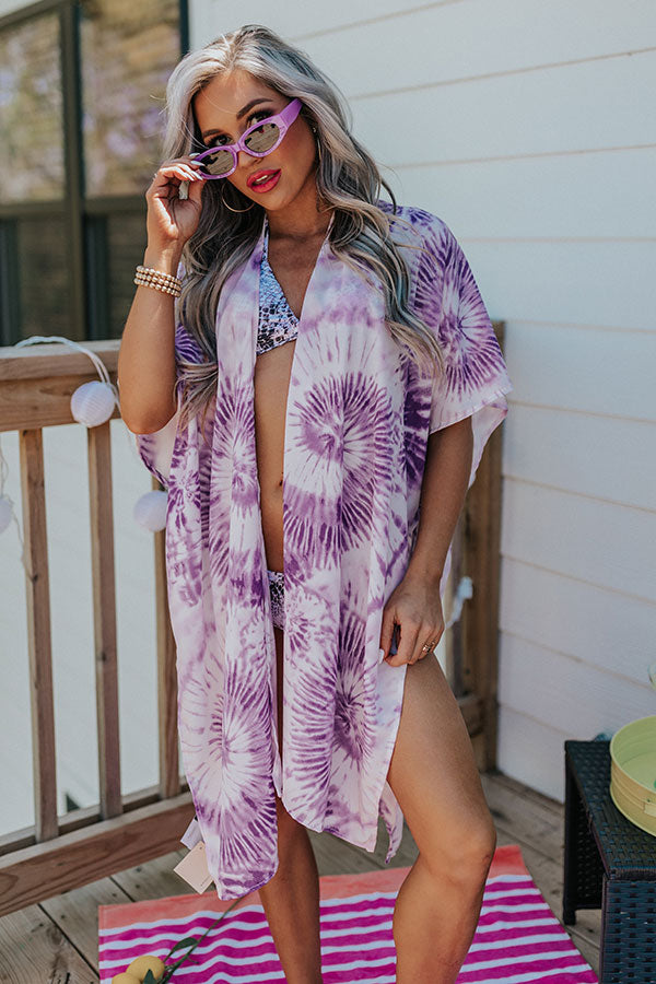 Our trendy 'Gone With The Waves' overlay is to 'dye' for with its lightweight breezy material, purple tie dye pattern, oversized half sleeves, and ultra draped open front silhouette that cascades into a straight knee-length hemline with high accent side slits! Measurements