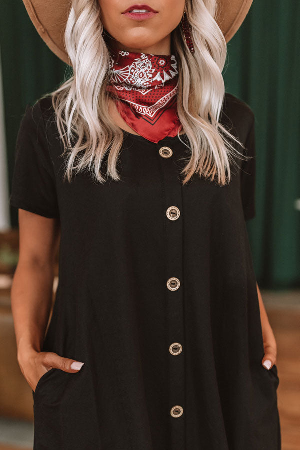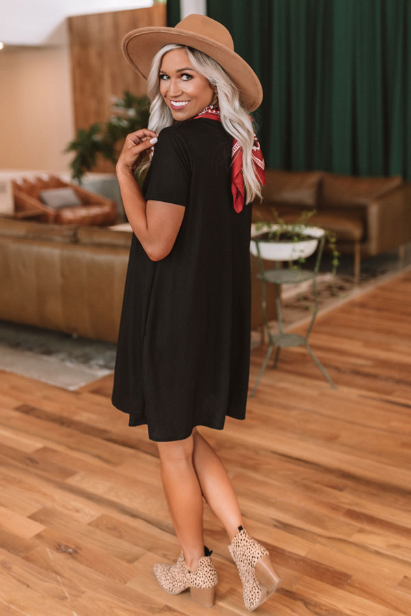 This black shift dress has "got it flowing on" with its button down font, scooped neckline, short sleeves, pockets, and loose silhouette with a straight hemline! We have styled this trendy piece with leopard booties, a denim jacket, and have accessorized with a neutral faux suede hat and by tying a floral hair scarf around the neck, but you can also pair it with colored accents like "The Parker Faux Suede Lace Up Heel in Violet" and our "Shine Your Light Hoop Earrings in Violet!" Measurements
