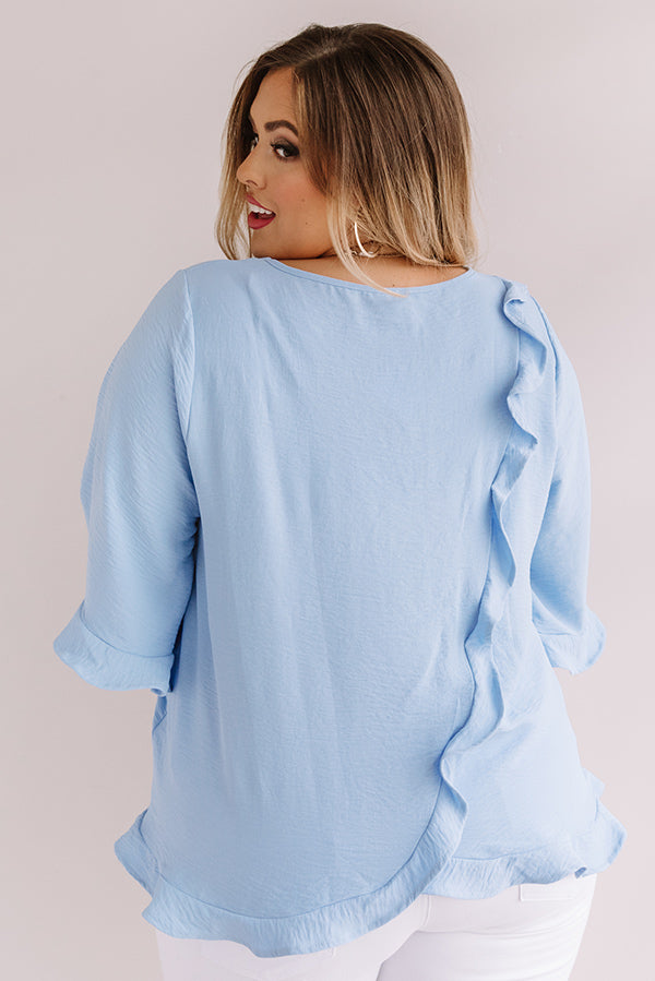 Plus Size - Be your own kind of beautiful in our charming sky blue colored "Grand Central Getaway Shift Top" featuring ultra lightweight material, a high rounded neckline, ruffled trim detailing and a ruffled diagonal back seam, loose half sleeves with flared cuffs, and a relaxed silhouette that falls into a cropped uneven hemline! We have styled this casual cutie with some distressed white skinnies, neutral heels, and a quilted crossbody, but you can also wear it with some frayed jean shorts, "The Tipton Espadrille in Grey," and our "All Caught Up Headband in Grey!" Measurements