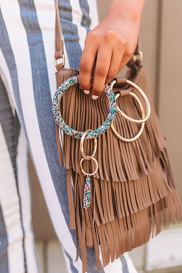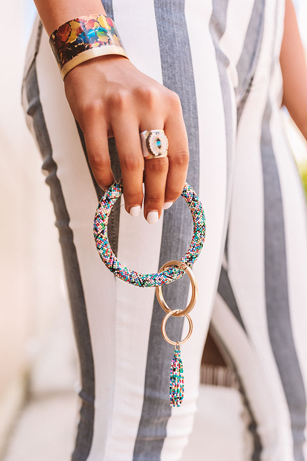 Your OOTD has the "grand potential" to look amazing when you accessorize with this adorable keychain featuring a large multi color beaded wrist ring, gold hardware, and multi color beaded tassel accent!