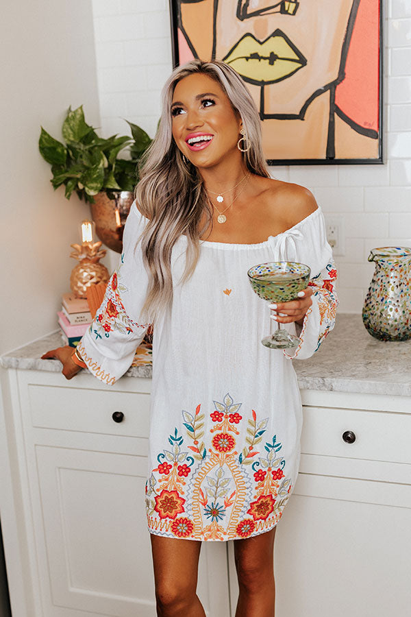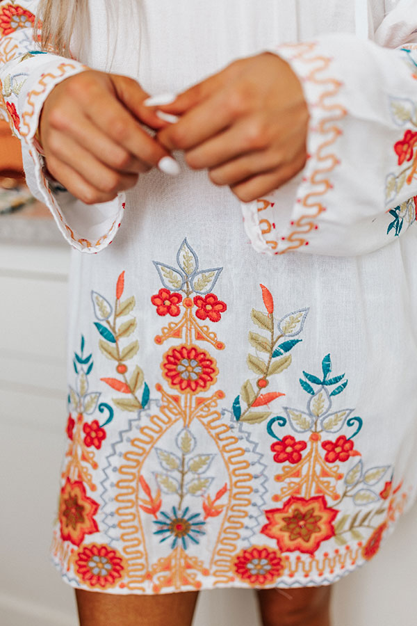 Spend your summer in luxury with this beautiful white shift top featuring lightweight material patterned with intricate and colorful floral embroidery, a flirty off-shoulder neckline with a tie closure, long oversized sleeves, and a relaxed silhouette that falls into a straight mid-thigh length hemline!
