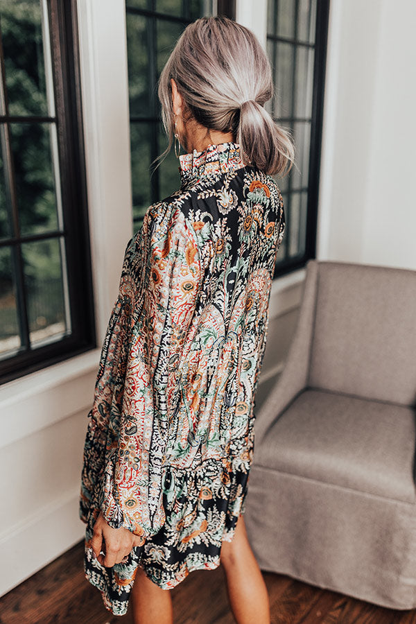 Have some fun at happy hour looking amazing in this gorgeous shift dress featuring sleek lightweight material patterned with an intricate teal, mustard, blush, and white hued floral print, a button down front with a collared neckline, long loose sleeves, and a relaxed silhouette that falls into a straight mid-thigh length hemline! Measurements