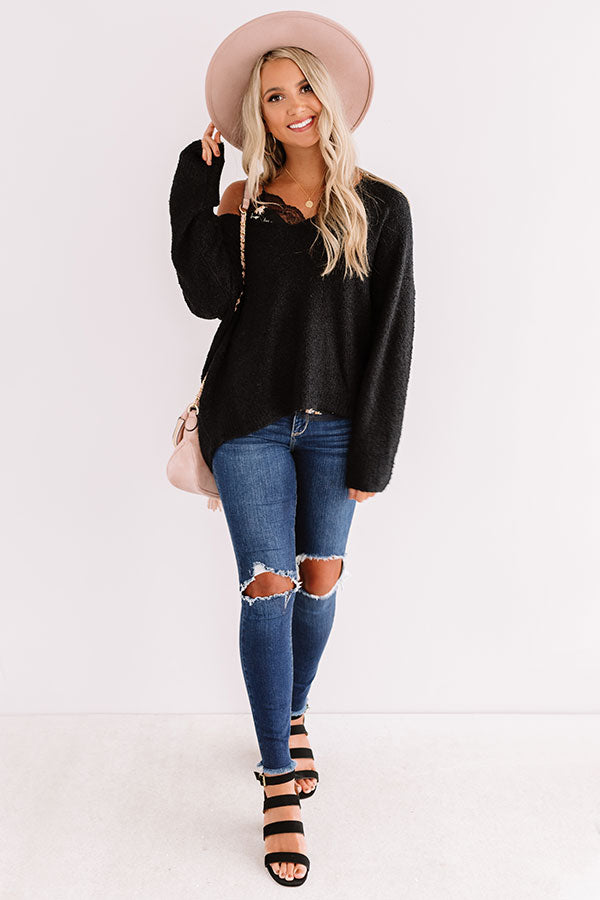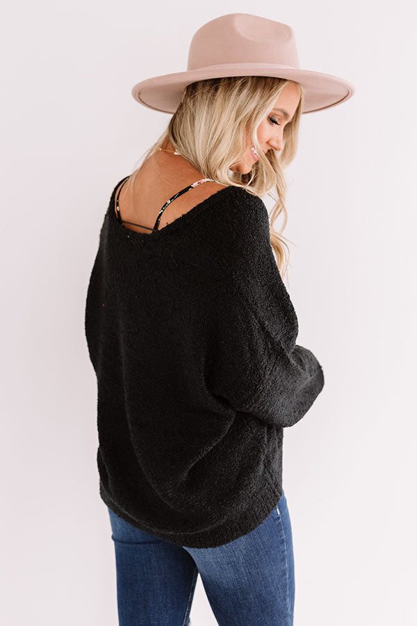 There is no better piece to wear when "headed to Aspen" than this darling black sweater featuring ultra soft and warm lightweight tight knit material, a wide v-cut neckline that can be worn off one shoulder, long loose bubble sleeves with fitted cuffs, ribbed trim detailing, and a relaxed silhouette that falls into a rounded hemline! Measurements