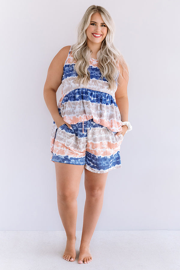 Plus Size - Relax in style with our adorable "Here And There" shorts featuring soft lightweight material patterned with horizontal blue, coral, and neutral/grey hued tie dye stripes, an elastic waistline with a tie belt, accent side pockets, and a relaxed pants silhouette that falls into straight mid-thigh length hemlines! This comfy piece styles perfectly with our matching "Here And There Tie Dye Babydoll Tank in Navy" or our "Here And There Tie Dye Shift Top in Navy," a scrunchie, and some fuzzy slippers for the ultimate two-piece lounge look!