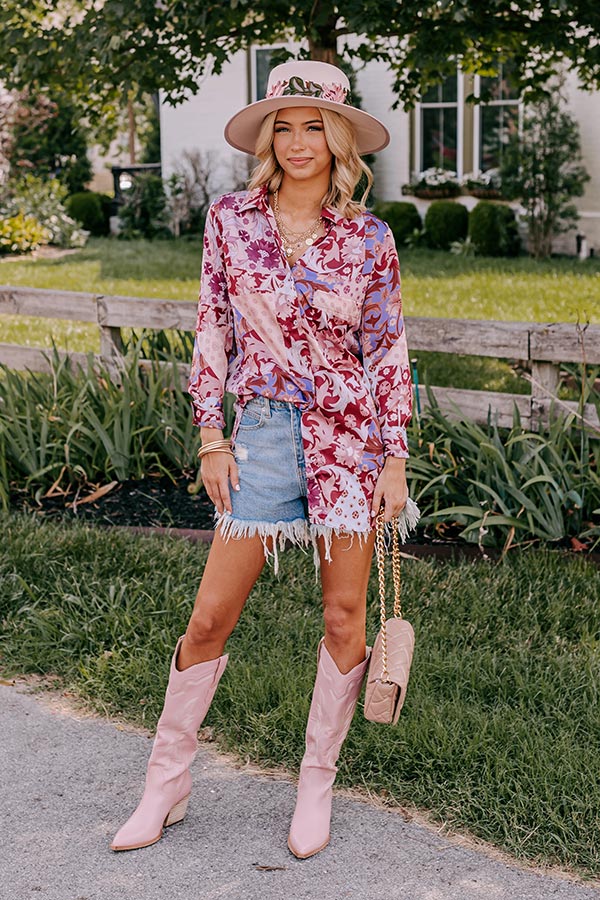 - Unlined material with an abstract floral print featuring various pink and purple hues