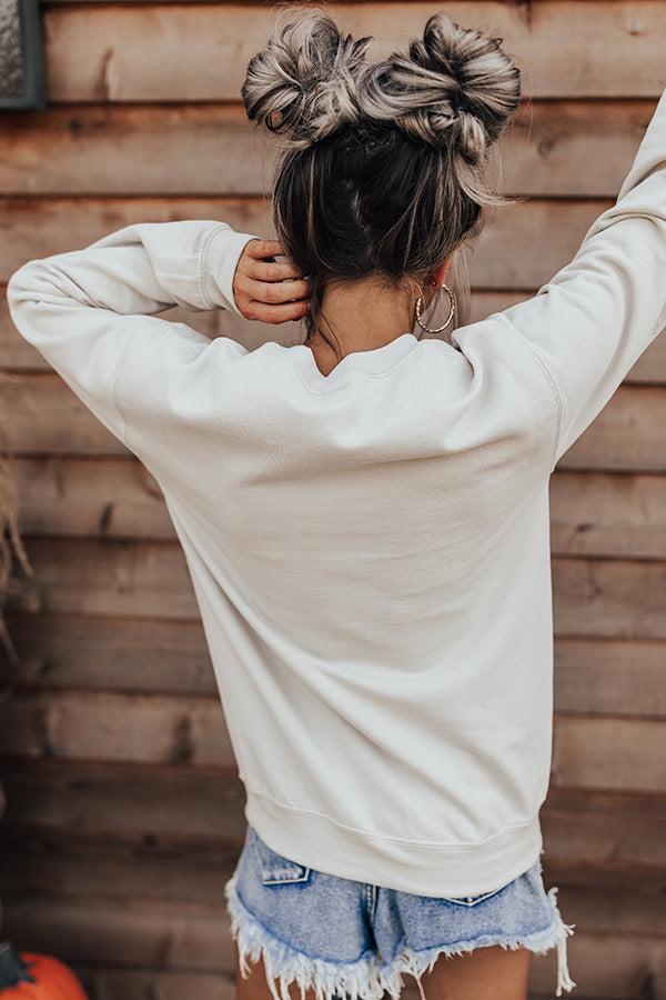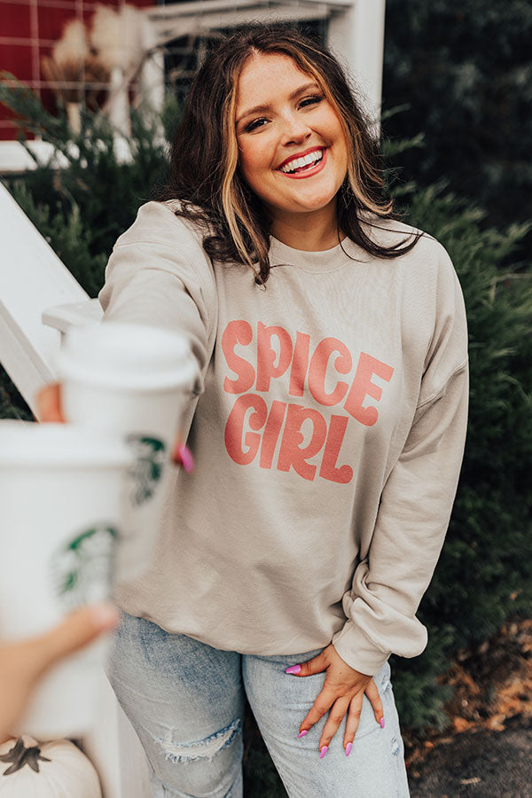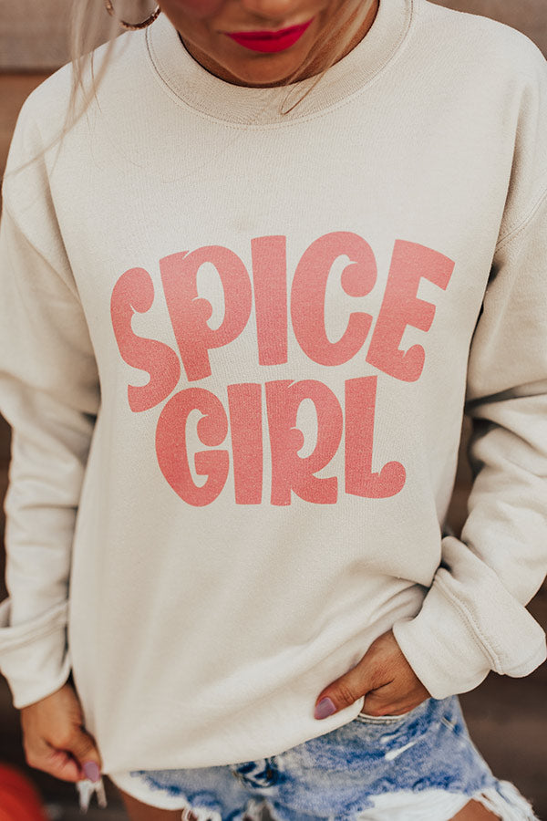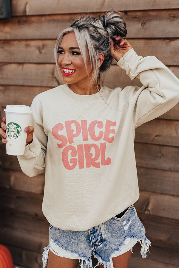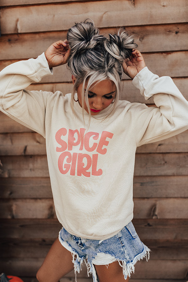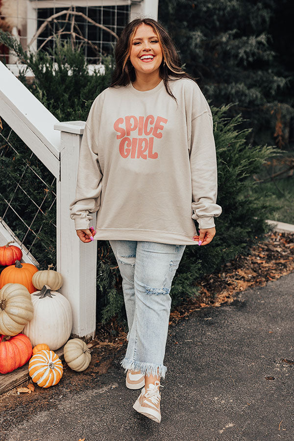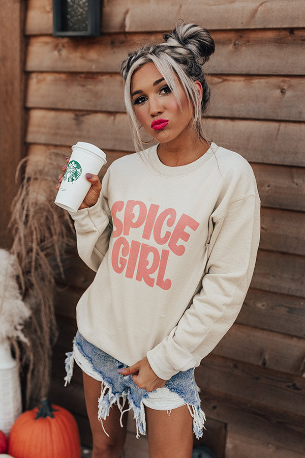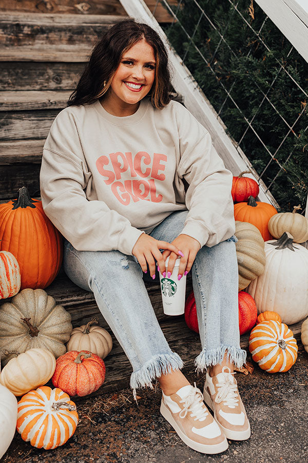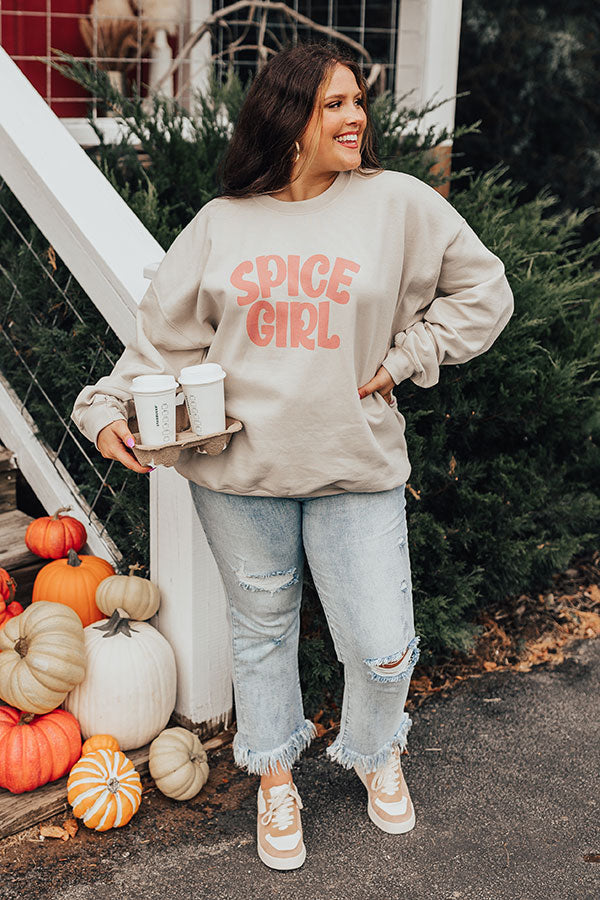 Spice up your fall wardrobe with this darling light natural hued sweatshirt featuring soft material with a cute orange spice girl graphic on the front, a rounded neckline, long loose sleeves with fitted cuffs, and a slouched silhouette that ends in a straight hemline! Measurements