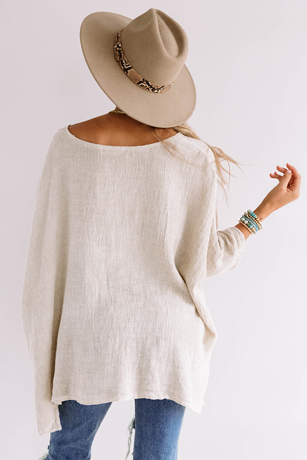 This chic birch colored top is sure to blow in the island breeze with its lightweight linen material, a wide scooped neckline, loose 3/4-length sleeves, and an ultra relaxed silhouette that falls into an uneven tunic-length hemline! Measurements