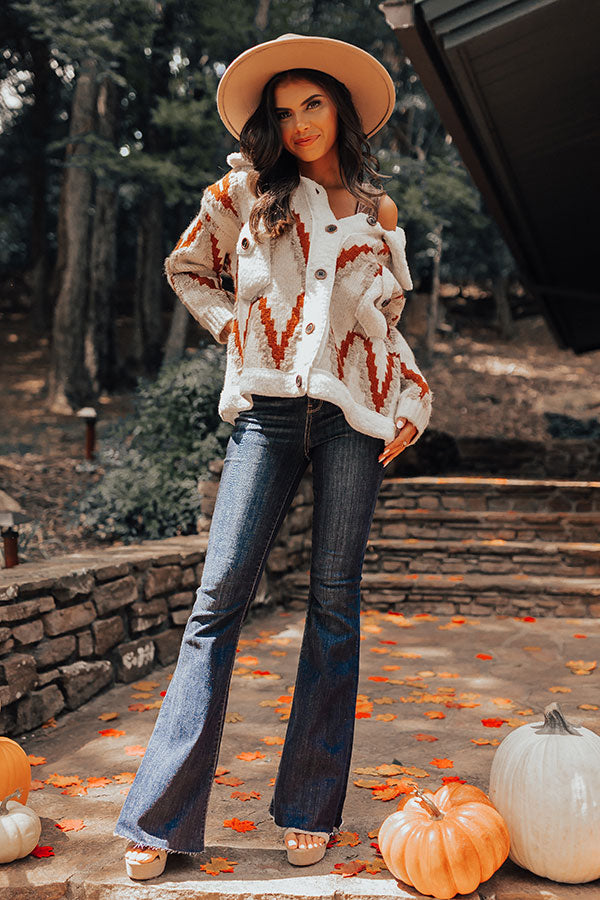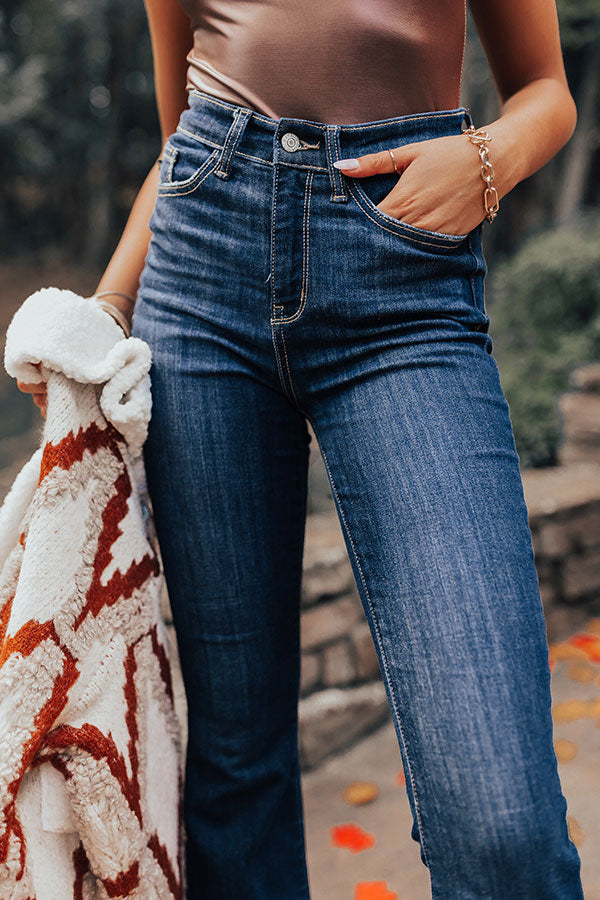 Stay groovy in our adorable 'Abigail' flare featuring dark wash denim material with accent fading, a high waistline with belt loops, a hidden zip fly with a button closure, a classic four-pocket cut, and a flattering figure hugging silhouette that ends in frayed ankle-length flared hemlines!