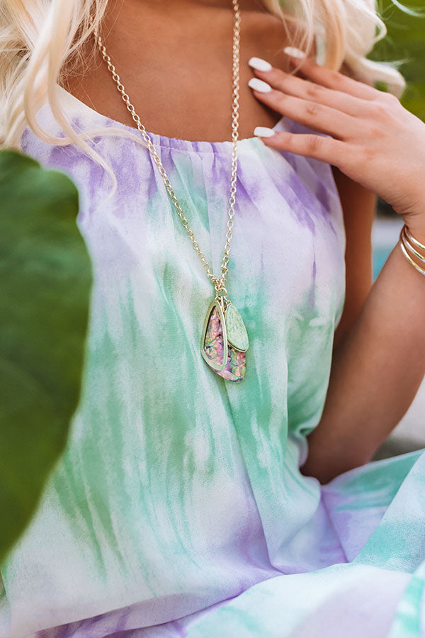A trio of pre-curated charms gives off a collected feel with the "Mckenna Gold Charm Necklace in Sea Green Mix," highlighting a custom shape inspired by a pebble found on the beach!