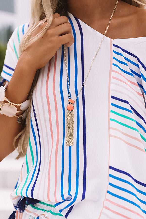 Add some length to your layers with the "Tae Gold Long Pendant Necklace in Bright Coral Magnesite," featuring a bold stone accent and some seriously fun fringe!