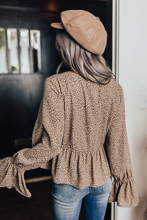 Keep your look flirty with our adorable taupe hued 'Living In Style' top featuring lightweight flowy material patterned with a small brown leopard print, a v-cut neckline long bishop sleeves with flared cuffs, and a cute babydoll silhouette that falls into a straight hemline! Measurements