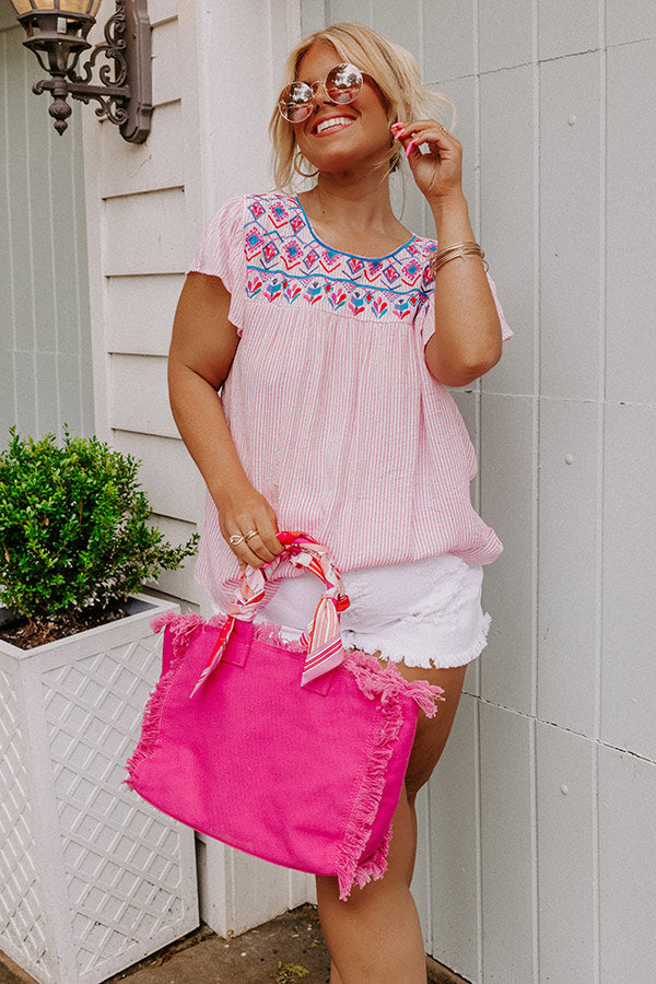Add a unique piece to your wardrobe with our pretty plus size 'Long Ago' shift top featuring lightweight material with colorful floral embroidered detailing, subtle vertical pink pin stripes, a rounded neckline, short ruffled sleeves, a keyhole accented upper back with a button closure, and a relaxed silhouette that falls into a straight hemline!