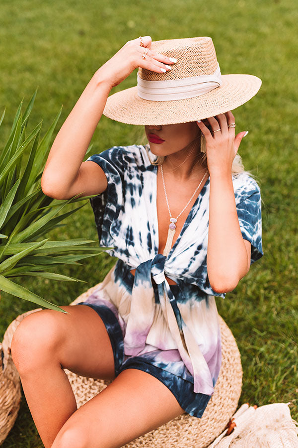 Spend your summer in color with our stunning "Love Triangle" romper featuring soft lightweight material patterned with navy, muted gold, and blush hued tie dye, a deep v-cut neckline with a large tie closure, oversized short sleeves, a wide smocked waistline, a keyhole accented upper back with a button closure, and a relaxed shorts silhouette that falls into straight upper-thigh length hemlines! We have styled this gorgeously unique piece with some matching block heels and a woven hat and tote, but you can also wear it with "The Alba Wedge in Ivory!" Measurements