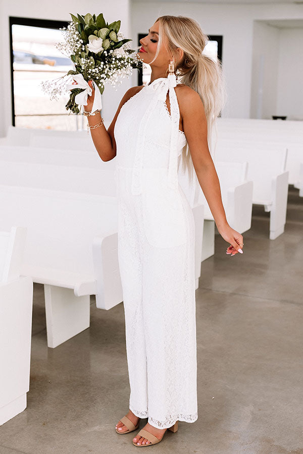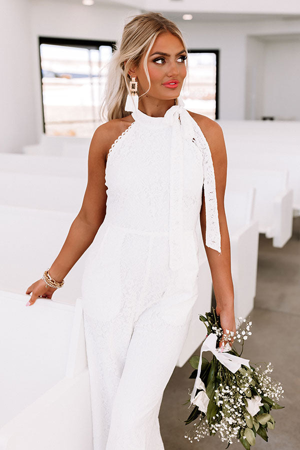We have no doubt you will love this beautiful white jumpsuit the most with its lightweight lace material, a rounded neckline with a large bow closure, a sleeveless silhouette, a zip closure in the back, hidden side pockets, and a flattering pants silhouette that ends in straight ankle-length hemlines!