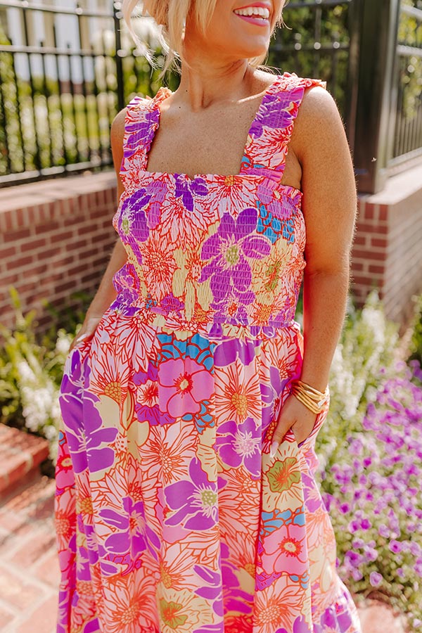 Life life colorfully in our beautiful purple plus size 'Made For Shade Midi' dress featuring lightweight material patterned with a colorful neon floral print, a smocked bodice with a square neckline, wide subtly ruffled trim shoulder straps, hidden side pockets, and a relaxed skirt silhouette that cascades into a straight ankle-length hemline!