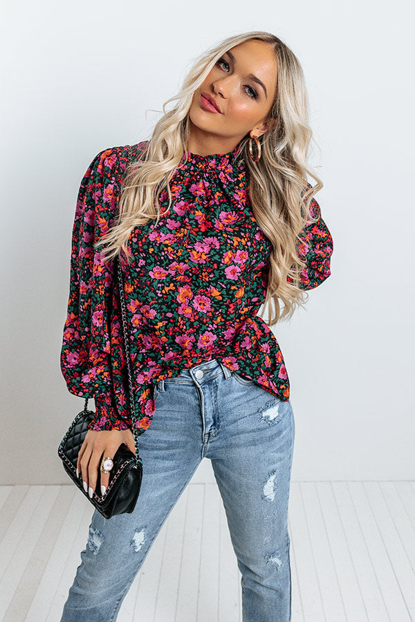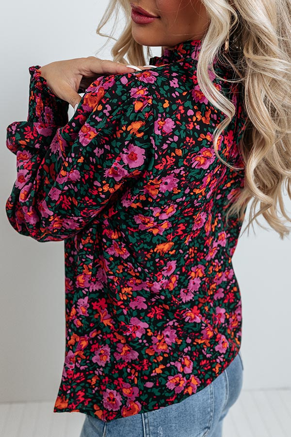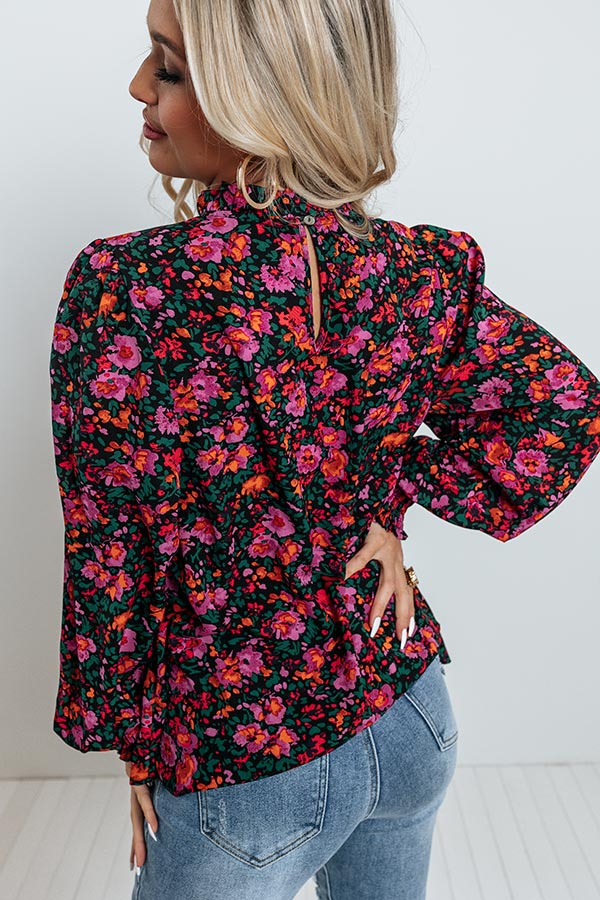 Make your date night look magical with this darling black shift top featuring lightweight material patterned with a fuchsia hued floral print, a high neckline, a keyhole accented upper back with a button closure, long loose sleeves with smocked cuffs, and a relaxed silhouette that falls into a straight hemline!