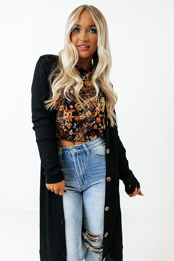 Get ready for some fall festivities in our black hued 'Making Memories' ribbed cardigan. It features a lightweight knit material, v-neckline, long sleeves, and side accent slits, with the option of button up front closure or an open draping silhouette which falls to a straight calf-length hemline.