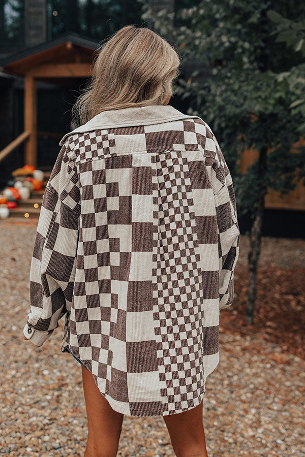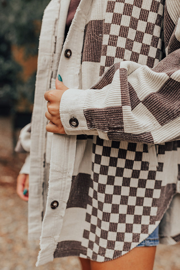 - Unlined corduroy material with an ivory and brown hued checkered print