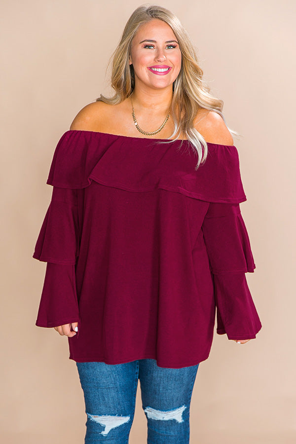 Plus Size - Off the shoulder, and off the charts... The "Melrose Moment Off Shoulder Top" is the "day to play" top your closet has been begging for! This lightweight knit top has a flirty flounced off-shoulder neckline, long tiered ruffle bell sleeves, and a relaxed knit silhouette that can easily be dressed up or down. Easily take your look from shopping to chardonnay with just a simple shoe change!