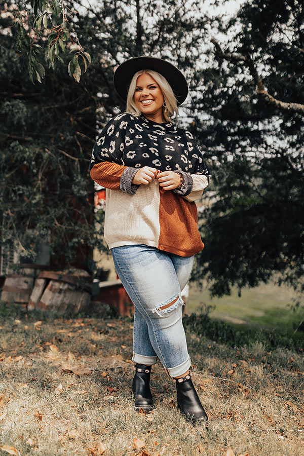 Plus Size - Keep warm but stylish in our gorgeous 'Merlot Sips Sweater' featuring soft tight knit material with black leopard print iced latte, and camel hued color block panels, a rounded neckline, long loose sleeves that can be rolled, and a slouched silhouette that falls into a straight hemline! Measurements