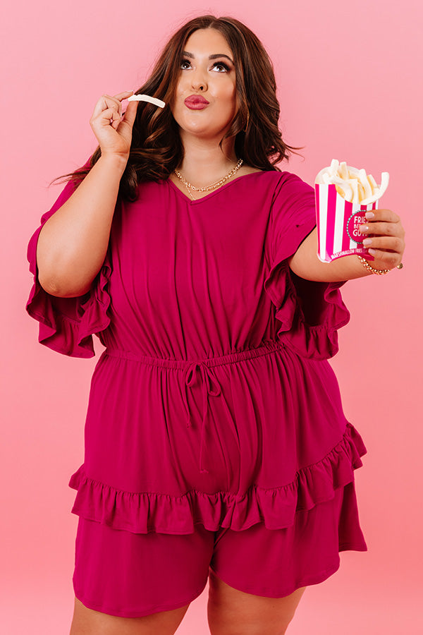 Plus Size - Slay all day in our stunning orchid colored 'Message In A Bottle Romper' featuring lightweight material, a v-cut neckline, short loose sleeves with flared cuffs, ruffled trim and accent seam detailing, a cinched waistline with a tie belt, and a relaxed shorts silhouette that falls into uneven mid-thigh length hemlines!