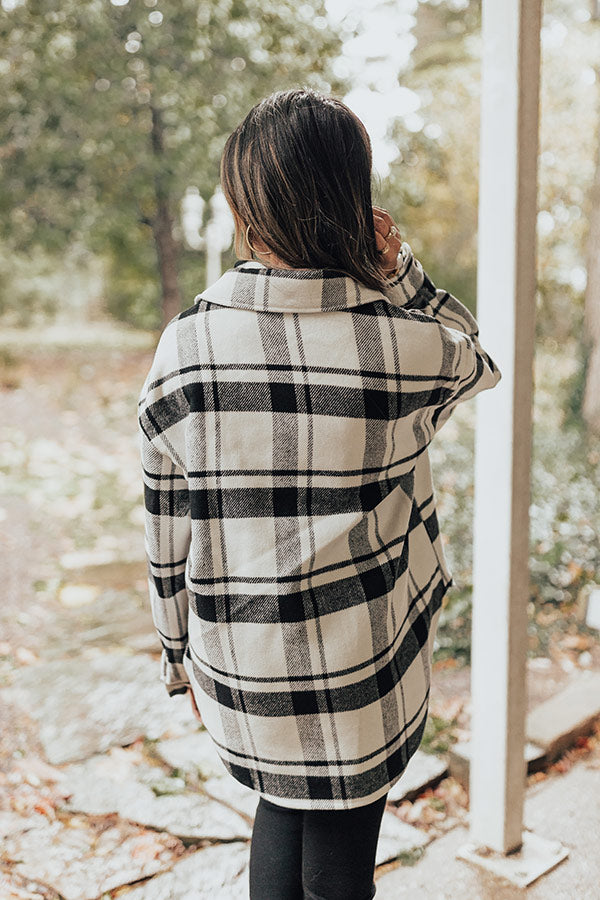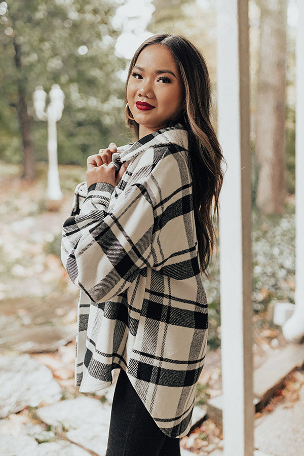 Keep warm all fall long in our trendy white 'Mulled Cider' jacket featuring thick material patterned with a large black plaid print, a button down front with a collared neckline, long loose sleeves with button closure cuffs, two accent chest pockets with flap closures, and a relaxed silhouette that falls into a rounded hemline! Measurements