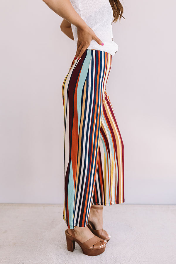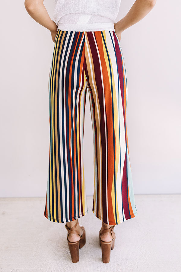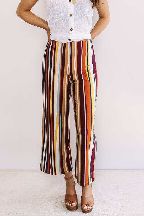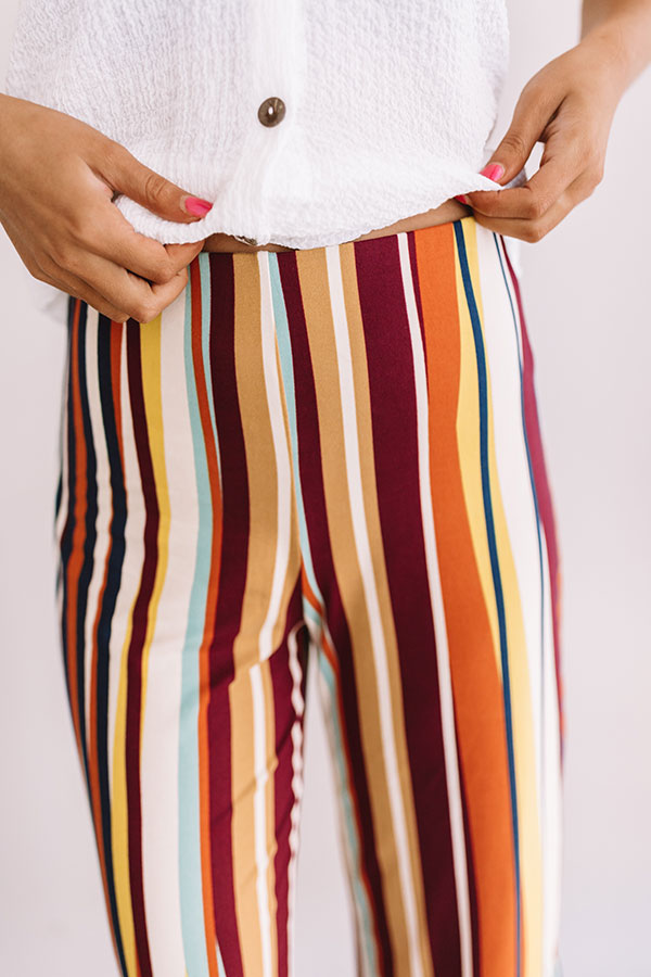 Whether you are headed to Woodstock or out for wine night, these retro striped pants are sure to liven up any outing! The "Woodstock Striped Pants" have a hidden elasticized waist that falls into a cropped wide leg pant with a soft and stretchy feel. Style these pants with a graphic tee and a casual block heel or wedge for you next outdoor concert, or dress your look up a bit with a fun statement earring and heels. Easily carry this look with you into fall with a cropped jean jacket!