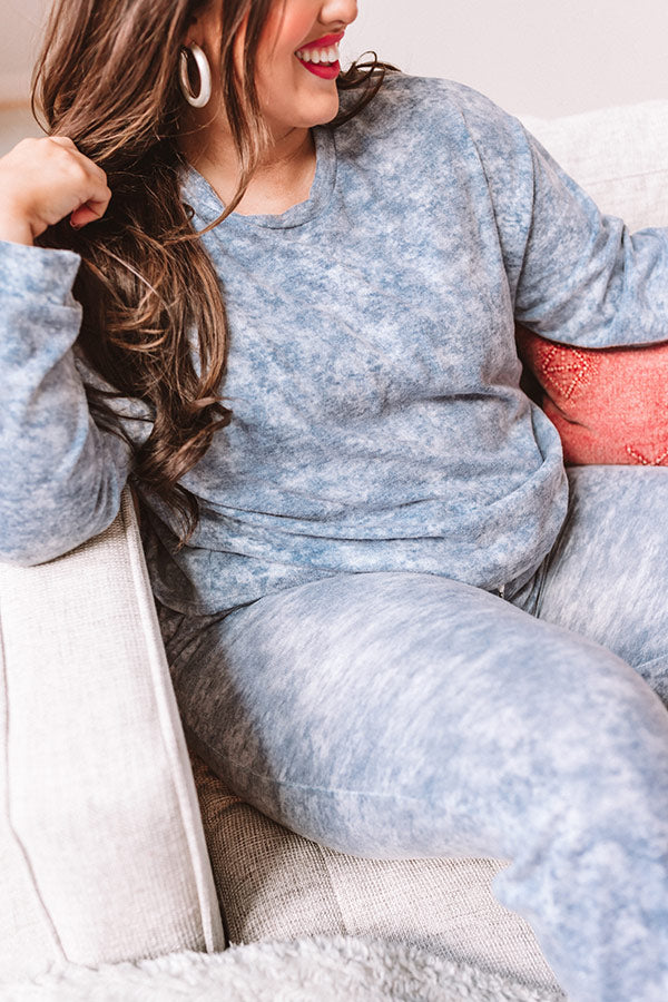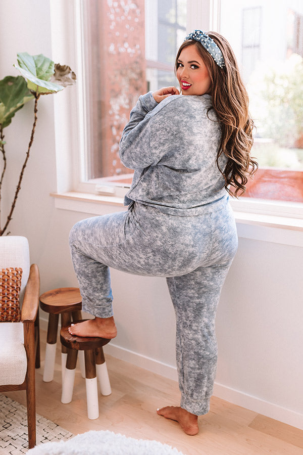 Plus Size - You won't find a more comfy piece to wear in your "off hours" than these adorable joggers featuring soft lightweight grey/blue material with an acid wash appearance, a wide elastic waistline with a tie closure, accent side pockets, and a relaxed pants silhouette that falls into fitted ankle length hemlines! This piece styles perfectly with our matching "Off Hours Sweatshirt," some fuzzy slippers, and a matching headband for the ultimate two piece lounge look! Measurements