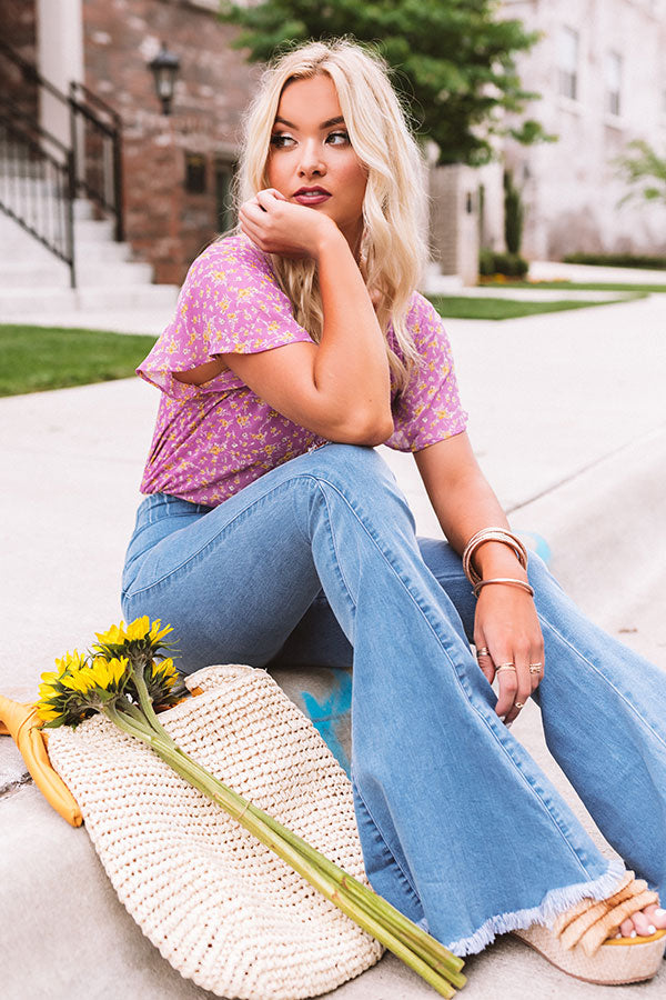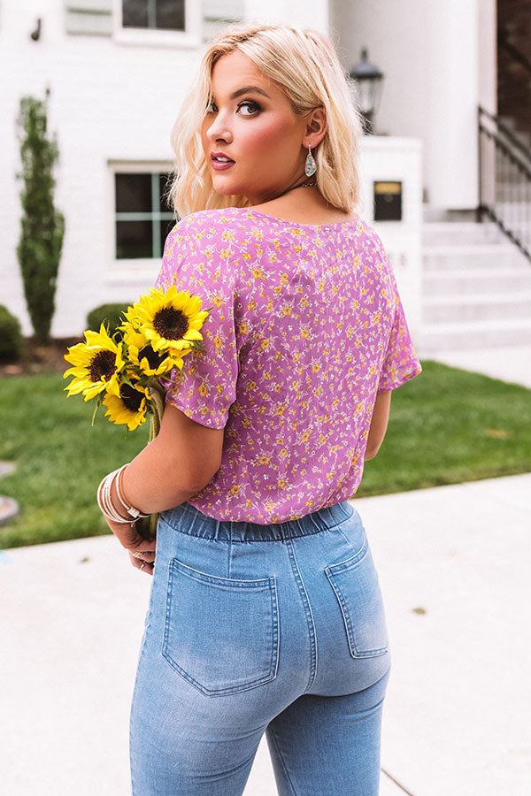 Welcome the warmer months in style with our adorable orchid colored "Paris Penthouse" bodysuit featuring lightweight breezy material patterned with an intricate floral print, a wrapped bodice with a deep v-cut neckline, short loose sleeves, and a relaxed silhouette that falls into cheeky bottoms with a snap button closure! You can style this charming piece under any type of bottoms and wear any type of outerwear with it for a variety of looks that will carry you from season to season! Measurements