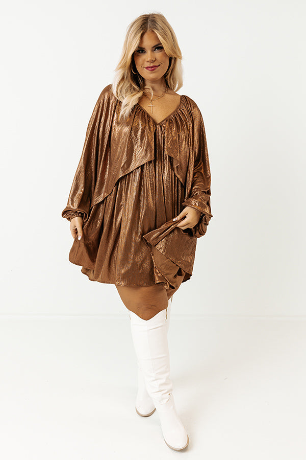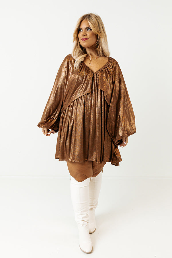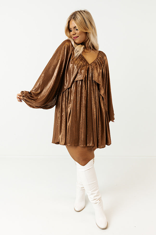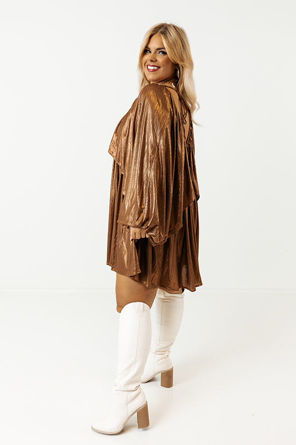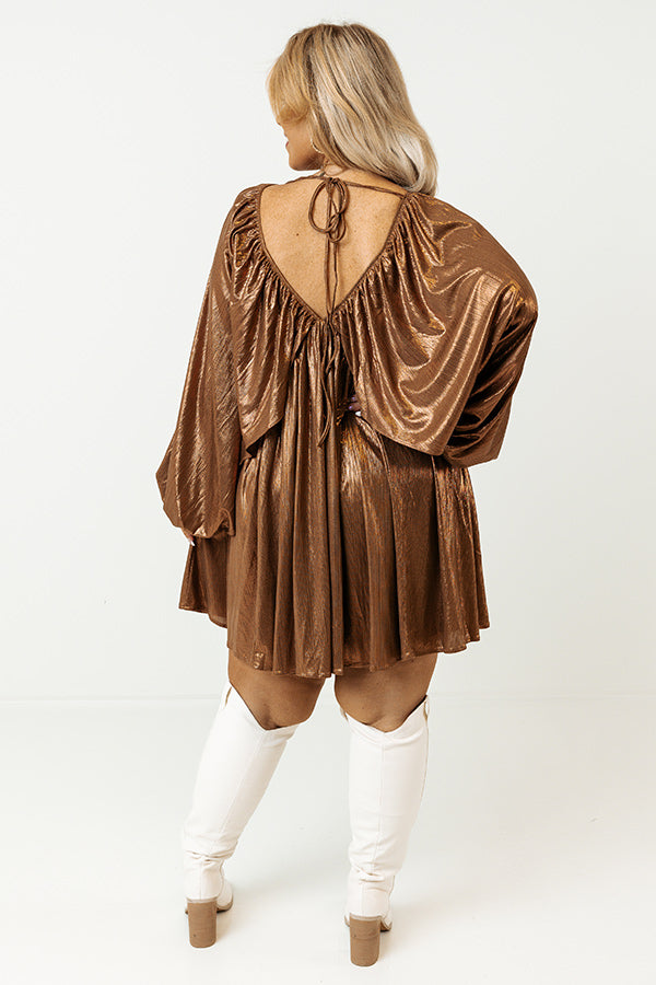 Bring on the glam this season in this gorgeous babydoll dress! Features beautiful textured camel colored metallic material, a draped overlaid bodice that cascades into long oversized batwing sleeves with high underarm slits and elastic band cuffs, a deep v-cut neckline and upper back with a tie closure, and an ultra relaxed silhouette that falls into a rounded mid-thigh length hemline.