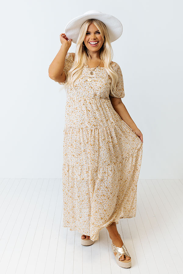Let your style bloom in our beautiful cream hued plus size 'Positano Twirls' maxi dress featuring lightweight material patterned with a small floral print, a flattering neckline and upper back, short puff sleeves, and a relaxed tiered skirt silhouette that cascades into a straight ankle-length hemline!