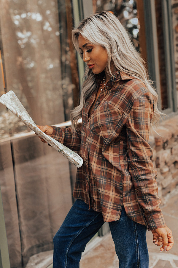People are sure to envy you when you arrive in this fall essential! Our brown 'Pumpkin Spice Life Flannel' features lightweight material patterned with a natural and grey hued plaid print, a button down front with a collared neckline, long loose sleeves with button closure cuffs, a single accent chest pocket, and a relaxed silhouette that ends in a rounded hemline!