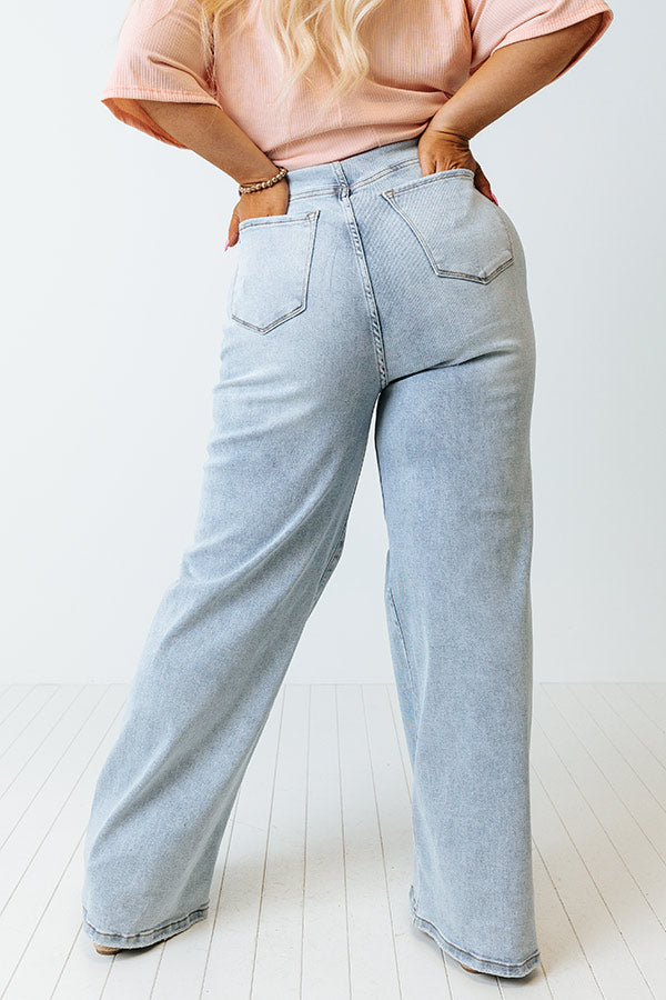 Guaranteed to be your new fave denim bottoms, our trendy plus size 'Glade' flare features lightweight light wash material with accent fading, a high waistline with belt loops, a hidden zip fly with a button closure, a classic four-pocket cut, and a relaxed but flattering silhouette that falls straight into subtly flared ankle-length hemlines!