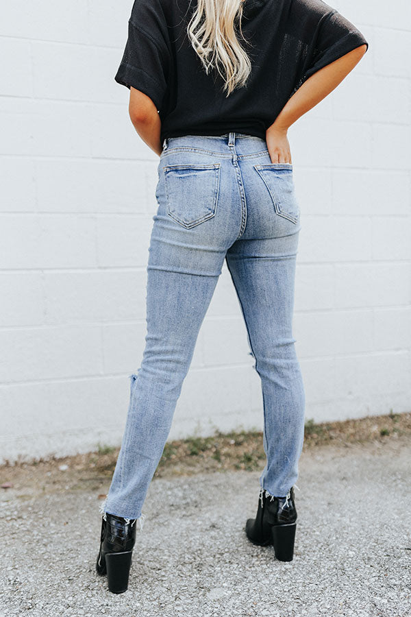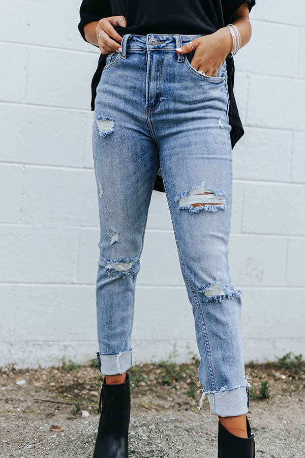 Upgrade your wardrobe denim with our flirty 'Seera' jean featuring lightweight light wash material with distressed detailing and accent fading, a high waistline with belt loops, a classic four pocket cut, a hidden zip fly with a button closure, and a flattering figure hugging silhouette that ends in straight ankle-length hemlines that can be cuffed!