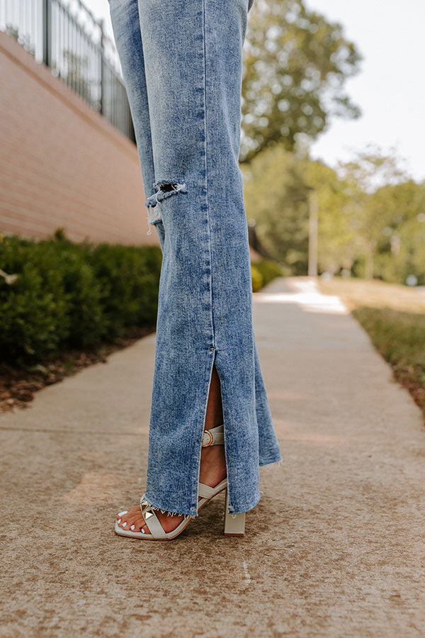 Take your denim wardrobe up a notch with our cute 'Utah' jean featuring medium wash material with distressed detailing and accent fading, a high waistline with belt loops, a hidden zip fly with a button closure, a classic four-pocket cut, and a flattering straight leg silhouette that ends in raw-cut ankle-length hemlines! on products