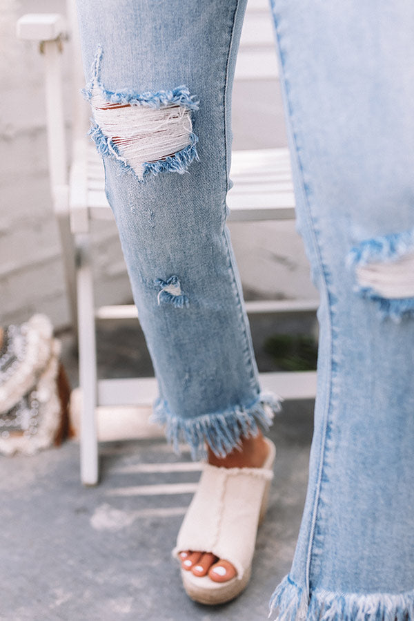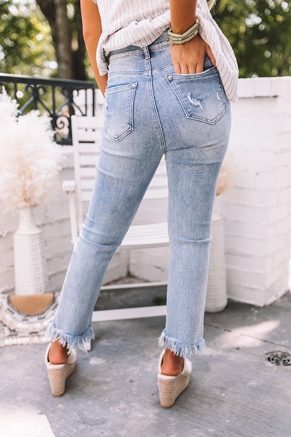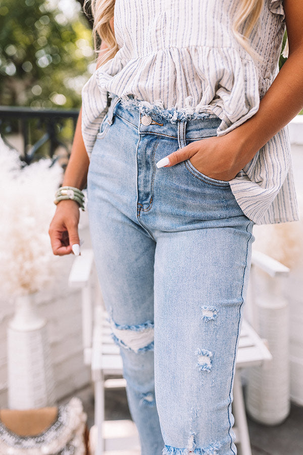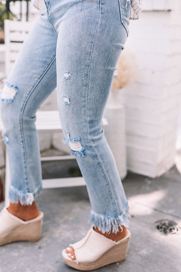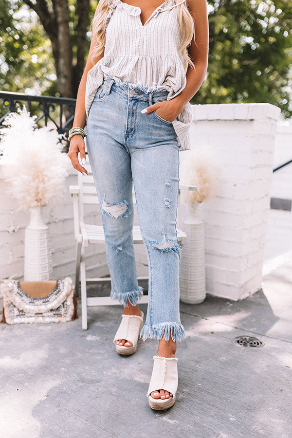 Let your soul run free in our adorable 'Wensley' jeans featuring lightweight light wash material with accent fading and distressed detailing, a high waistline with belt loops, a classic four pocket cut, a hidden zip fly with a button closure, and a relaxed silhouette that falls straight into ultra frayed ankle-length hemlines!