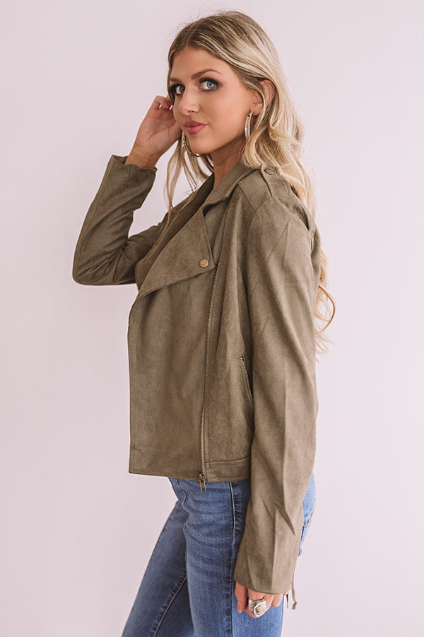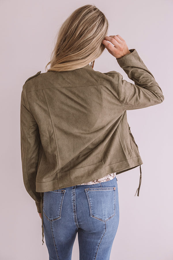 Week day or weekend, the "Savvy in the City Faux Suede Jacket" is just what you need to spice up any look! This olive colored faux suede jacket has a collared neckline with notched lapels, shoulder epaulets, long sleeves with zipper accented cuffs, diagonal cut zip pockets with braided tassel ties, and a faux suede bodice with zip closure! Layer this jacket over a chic satin camisole for girls night out, or keep your look casual by pairing this jacket with a basic tee... your style options are endless!
