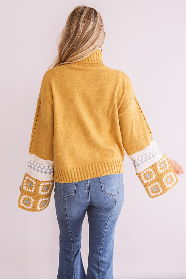 You will undoubtedly want to "show off" this charming mustard hued shift sweater featuring soft lightweight tight knit material, ribbed trim detailing, a rolled turtle neckline, long loose sleeves with ultra flared cuffs, side slits, and thick grey and white intricately woven crochet detailing, and a relaxed silhouette that falls into a straight hemline! This boho piece styles perfectly with some denim flares and a neutral bootie and fringe crossbody, but you can also wear it with some distressed black skinnies, "The Jess Faux Leather Heel in Natural," and our "Classic Moment Wool Hat in Dark Grey!"
