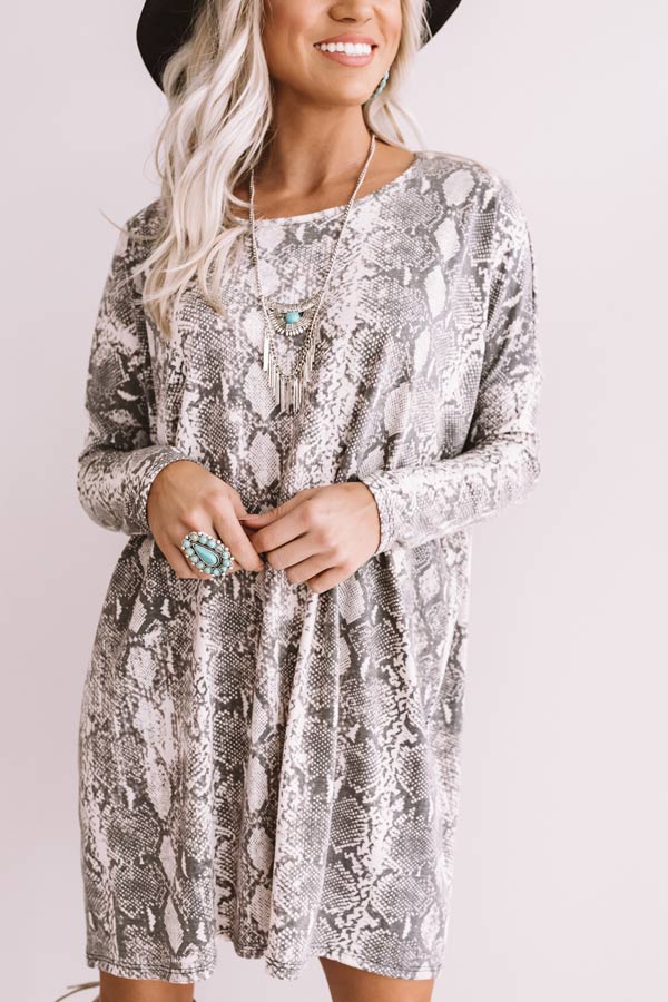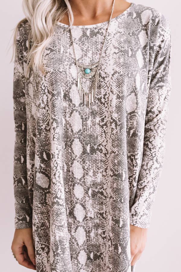 Sparks are sure to fly whenever you wear this striking shift tunic featuring lightweight stretchy material patterned with a white and grey snake print, a high rounded neckline, long form fitting sleeves, and an ultra relaxed silhouette that falls into a straight mid-thigh length hemline! This piece can be styled a variety of ways, like as a dress with neutral over the knee boots, turquoise statement jewelry, and a black faux suede hat and fringe crossbody, or front tucked into some colored flares or distressed skinnies with "The Seraphina Faux Leather Wedge in Grey!"