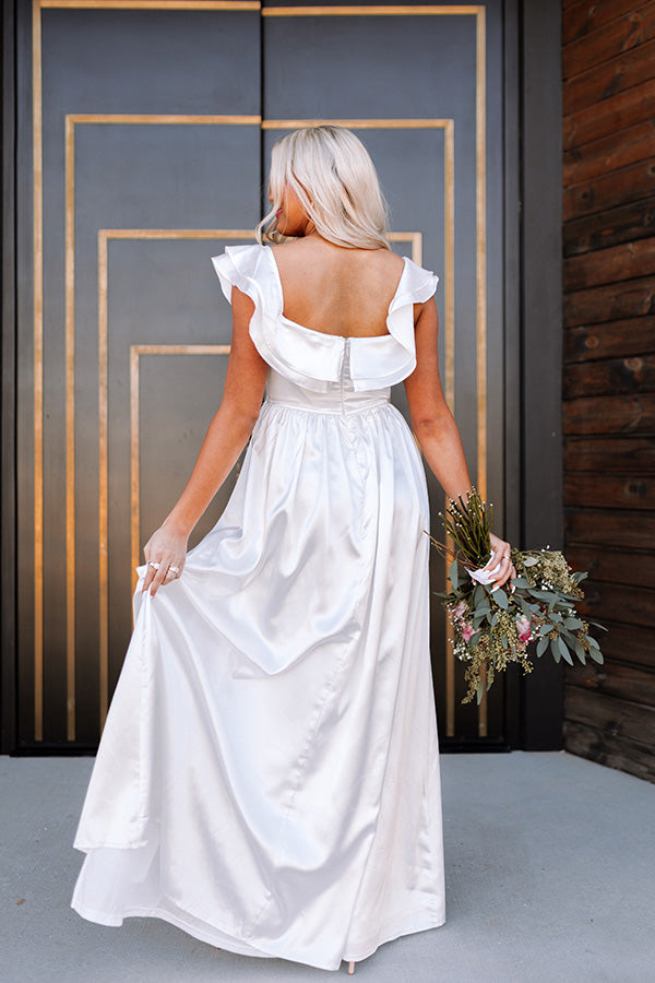 You are sure to make people speechless when you make an entrance in this beautiful white maxi dress featuring lightweight satin material, ruffled trim around the sweetheart neckline and over the cap sleeves, a zip closure back, and a relaxed silhouette that falls cascades into a straight floor-length hemline with an accent side slit!
